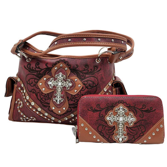 Western Style Concealed Carry Rhinestone & Studded Cross Design Shoulder Bag Purse and Wallet Set